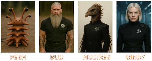 I fired up ChatGPT the other day and started playing around to see if I could get it to spit out something close to the picture in my head when I was writing the characters for Here There Be Monsters. I couldn't get it perfect. For example, I wanted Bud to have a beer gut and Cindy to have longer hair. When I tried to make Pesh's upper tentacles longer the AI went complete ape shit. Still, I was decently impressed with how it turned out. If nothing else, it was a fun way to kill a few hours.
